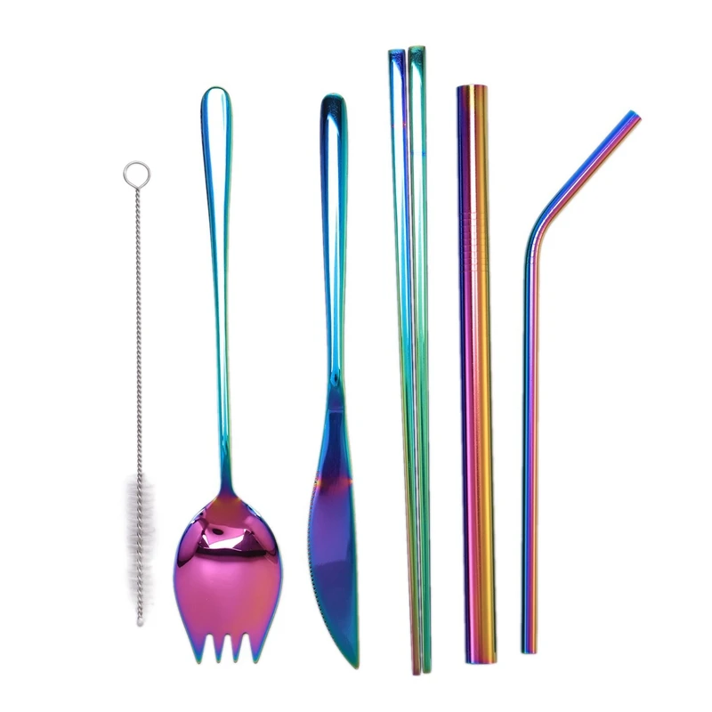 Discount Rainbow Dinnerware Set 6 Pcs Portable Cutlery Set with Cleaner Brush Stainless Steel Colored Travel
